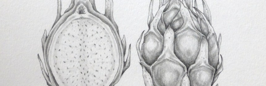 The above drawing shows the lovely fruit of the cactus Hylocereus costaricensis, or the Costa Rican Pitahaya. This fruit is known as “dragon fruit” to most, but the term “dragon fruit” applies to a variety of cacti within the genera Hylocereus and Stenocereus, both genera of night-blooming cacti native to South America. Fruit from Stenocereus cacti tend to be called